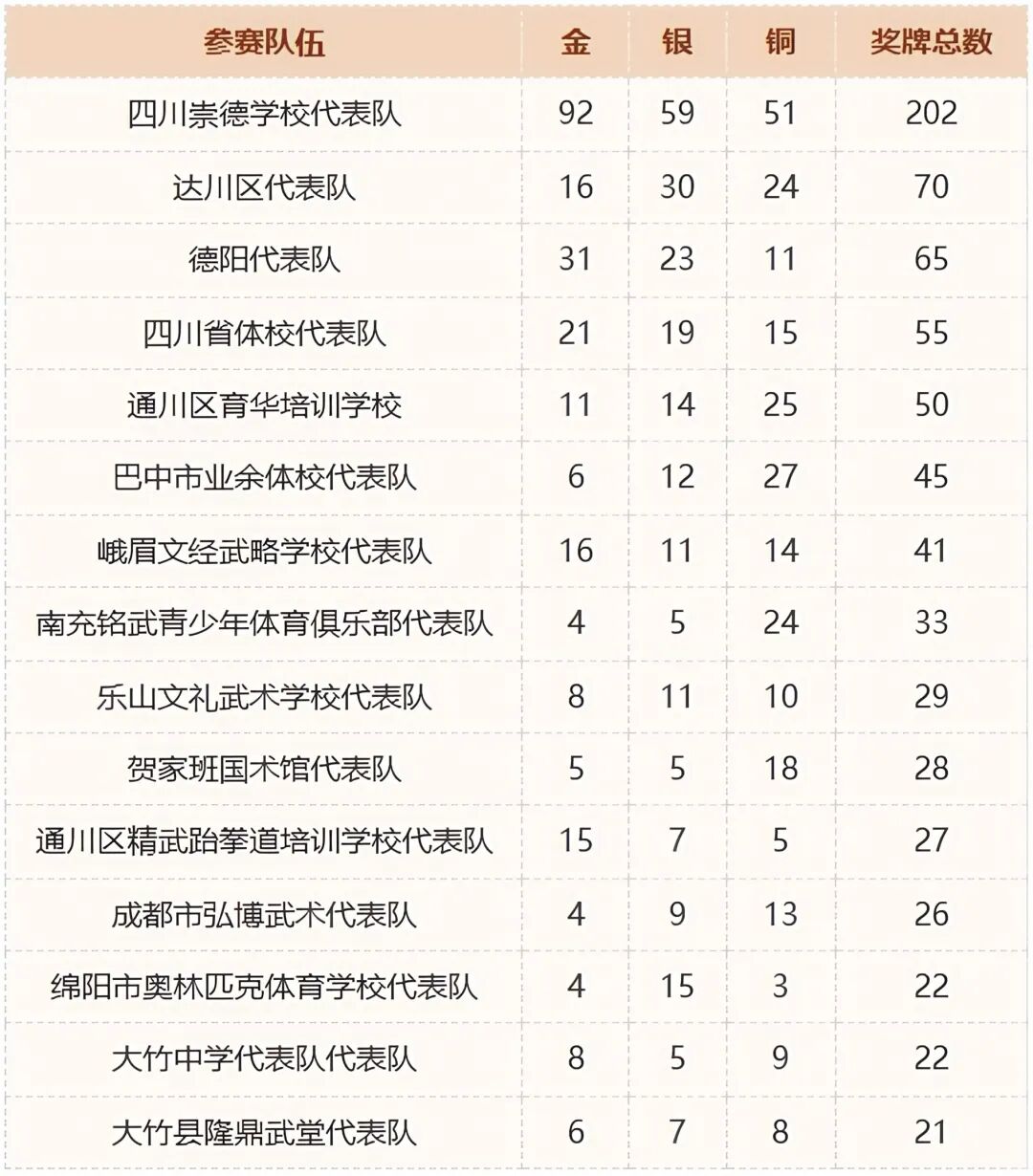 经过激烈角逐与严格评审,现将本届赛事各项荣誉公布如下: 南充铭武青少年体育俱乐部 广元贺家班国术馆 江油市长城实验学校 巴中业余体校 遂宁市武术队 虎贲青少年体育俱乐部 南充第十八中学 宜宾市散打队 巴中市拳击队 大竹县隆鼎武堂 通川精武跆拳道培训学校 宜宾奥龙武校 万源市智杰武道 峨眉文经武略学校 德阳队 通川区育华培训学校 宜宾市散打队 南充第十八中学 虎贲青少年体育俱乐部 绵阳队 宜宾队 德阳队 成都队 第一:虎贲青少年体育俱乐部 第二:四川崇德学校 第三:宜宾市散打队 第一:四川崇德学校 第二:宜宾队 第三:德阳队 于志强、胡聪、杨喆东、肖良、丁新川、张志涛、马山平、刘可佳、张振飞、谢金洋 武术套路:杨波、黄中成、谭立强、陈慧婷、张粤乔、吴 东 武术散打:代凌江、张界、范伟、张小波 拳 击:夏明全、杨文辉、陈浩、罗爽、肖乔 向所有获奖队伍、教练员、裁判员及个人表示最热烈的祝贺!也为每一位勇于挑战、坚持完赛的选手点赞!比赛虽有胜负,但热爱不分高低,每一份努力都值得被铭记。 武术育人,强体砺心!期待未来有更多青少年走进武术的世界,同时欢迎各位同学、家长朋友到我校参观考察,共谋成长,共绘未来!